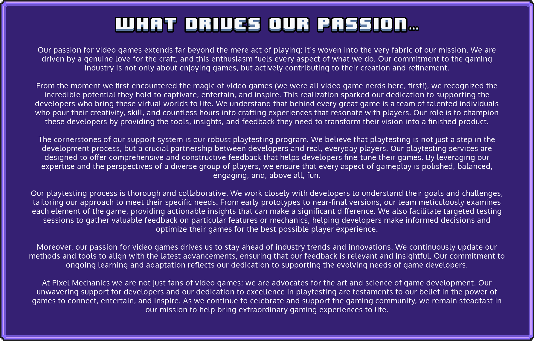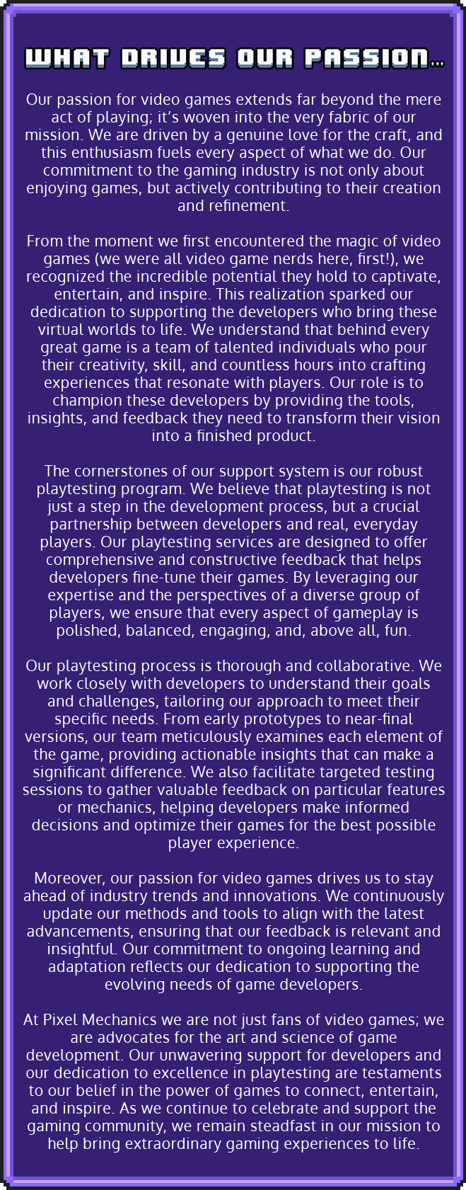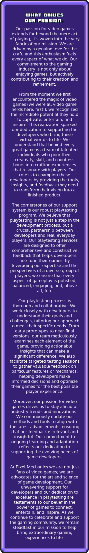 At our core, we’re a bunch of avid gamers who’ve spent countless hours navigating virtual worlds, mastering epic quests, and indulging in pixelated adventures. Our Pixel Mechanics team members bring their deep-seated love for games into everything we do, from brainstorming sessions to late-night playtesting marathons. If there’s a game out there, chances are we’ve played it and have an opinion about it!