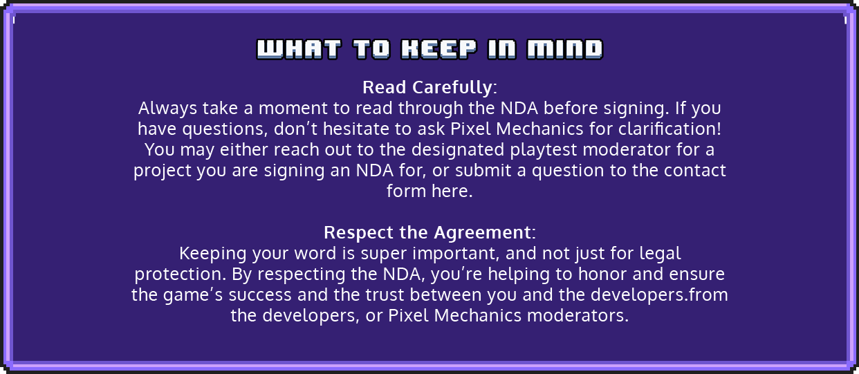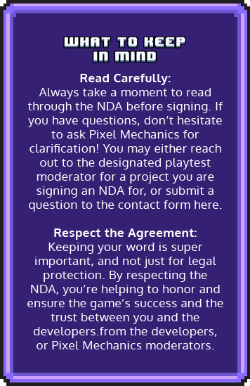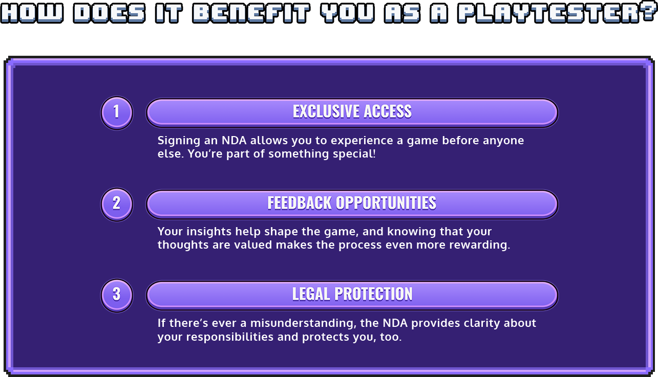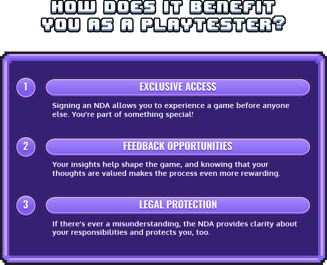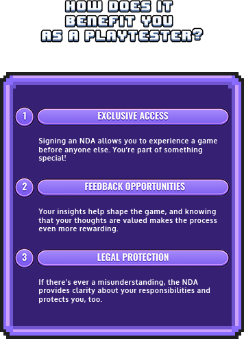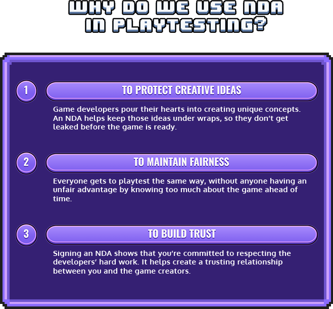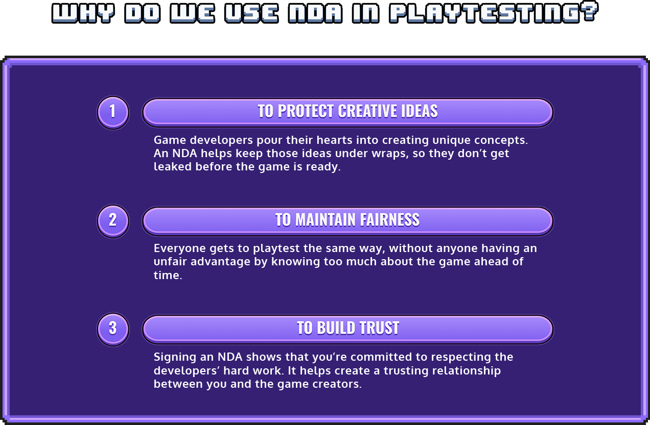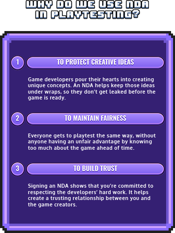 NDAs may sound serious, but they’re just a way to ensure that everyone involved in the playtesting process can share ideas and feedback safely. By signing an NDA, you’re joining a team of creators and testers working together to make a fantastic game.