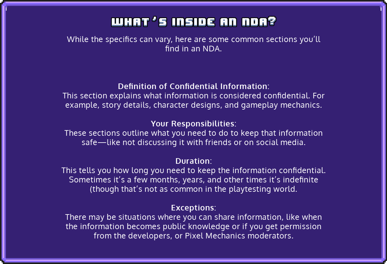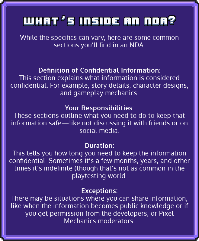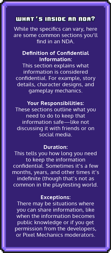 An NDA is a legal contract that helps protect sensitive information. When you playtest a game, you often get a sneak peek at cool features, storylines, and characters that aren’t ready for the public yet. An NDA ensures that you keep those secrets safe and sound.