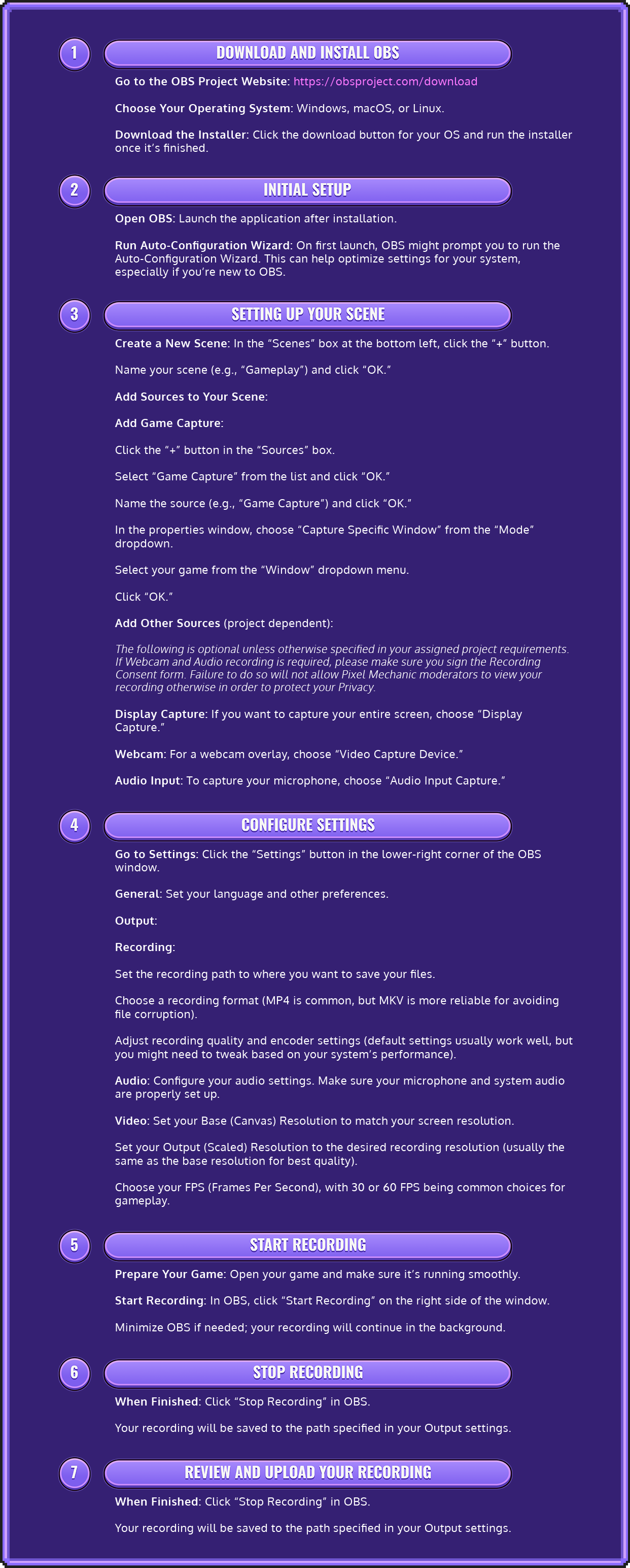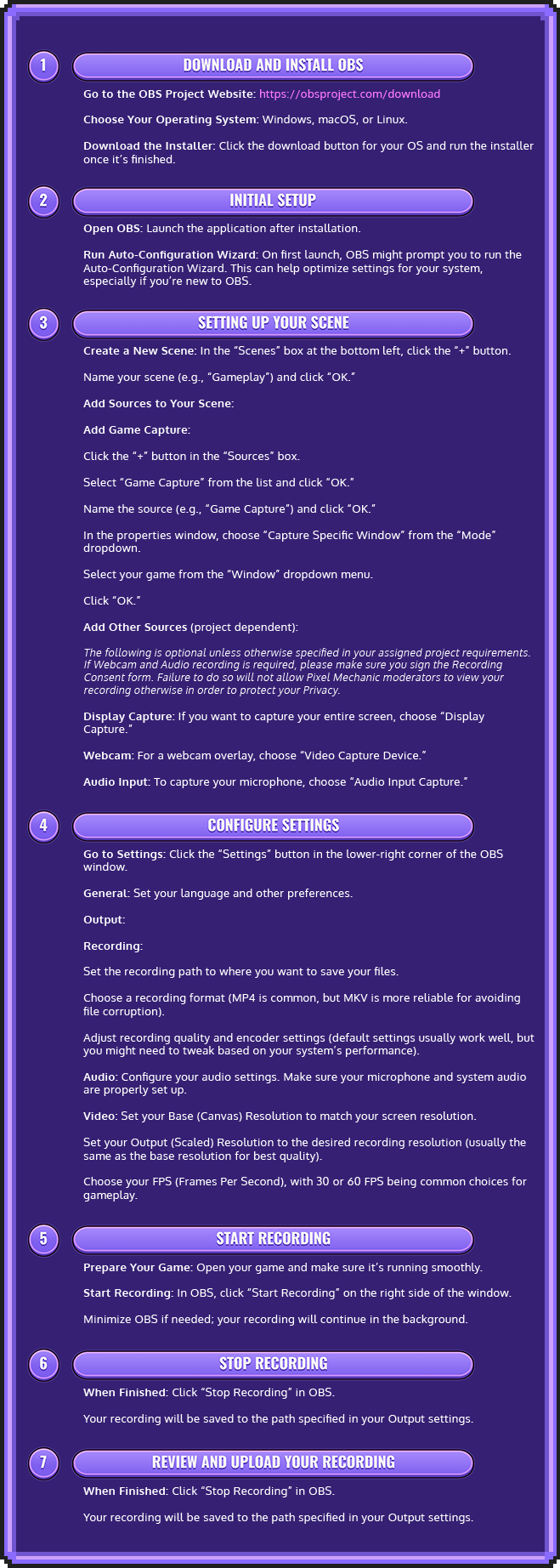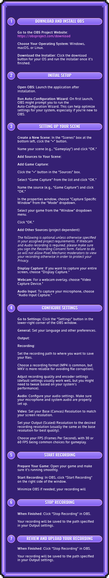 Pixel Mechanics partners with OBS (Open Broadcaster Software) in order to receive the highest quality recordings from our valuable playtesters. Recording playtesting is crucial because doing so captures a detailed, objective account of how you, the player, interacts with a game. This documentation allows Pixel Mechanic moderators and studio developers to review gameplay sessions later, analyze player behavior, and identify specific areas of confusion or difficulty that may not be apparent in real-time feedback. By reviewing these recordings, we and our partnered developers can gain deeper insights into your, the user’s, experience and make informed decisions about necessary improvements, all thanks to you.
